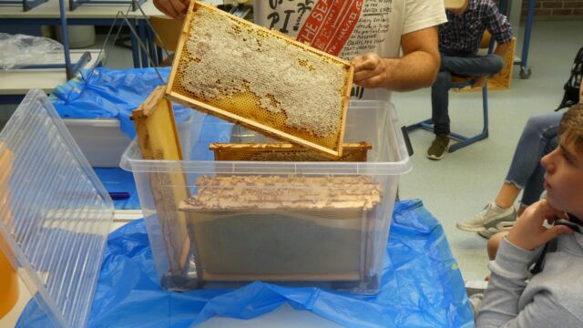 Im Mai 2018 war es dann endlich soweit, und das Schul-Bienenvolk traf endlich und fand ein schönes Plätzchen im Schul-Biotop. Über den Sommer hin verfolgte die Bienen-AG die Entwicklung des Volks und nach den Sommerferien war es endlich soweit, und es konnte die erste Honigernte erfolgen.